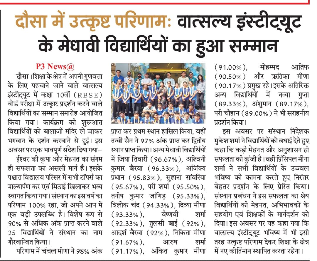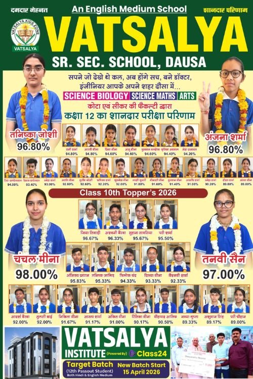 Vatsalya School, is Best RBSE school in Dausa, is renowned for its commitment to academic excellence and the overall development of students. Each year, our students achieve outstanding results, excelling in both academics and extracurricular activities. This reflects the high-quality education and personalized guidance provided by our experienced and dedicated teachers. Over the years, Vatsalya School has reached numerous milestones, empowering children with the confidence, leadership skills, and knowledge they need to succeed in their future endeavors.